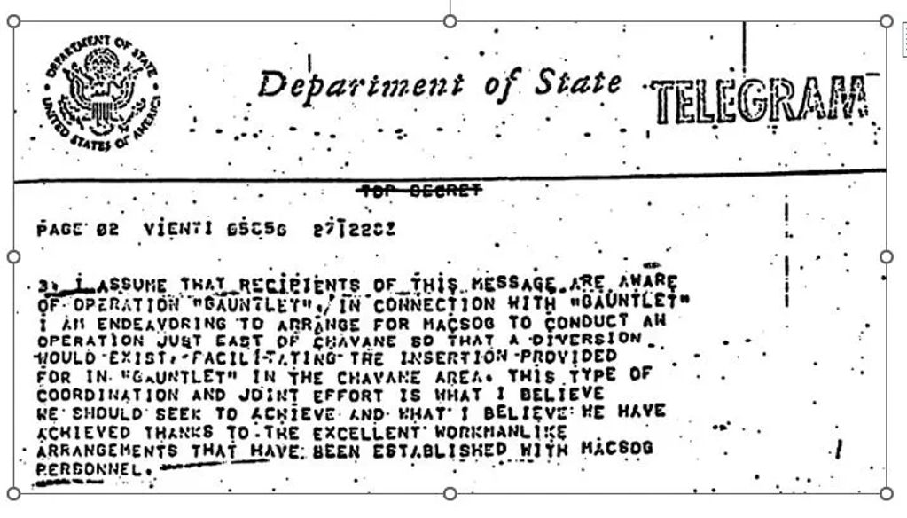 Tailwind was clearly in support of CIA Operation Gauntlet. This msg from Amb. Godly to the State Dept. asks MACSOG for a "diversion" east of Chavane.